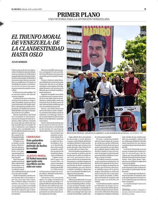 Caracas, 10 de octubre de 2025.- El vicepresidente de Estrategia, Comunicación y Relaciones internacionales de Primero Justicia, Julio Borges, aseguró este viernes que “las dictaduras al final se vencen con el liderazgo moral. La historia ha demostrado que es la fuerza del liderazgo moral la que termina derrotando una dictadura totalitaria”. Así lo dejó saber en sendas entrevistas concedidas a Noticias Caracol de Colombia y 120 minutos de España, tras conocer que María Corina Machado fue galardonada con el Premio Nobel de la Paz 2025.