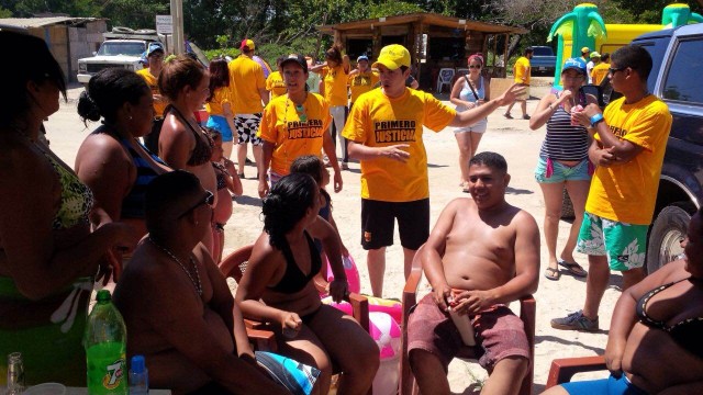 Miranda, 16 de febrero de 2015.- Los jóvenes de Primero Justicia en el municipio Brión han decidido tomar estos días de carnaval para llevar el mensaje de unión y cambio a los temporadistas que, por millares, se han desplazado a las costas del estado Miranda.