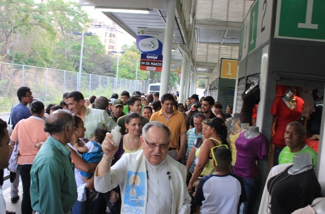 Caracas, 17 de abril de 2014.- Una singular misa celebraron los padres Arcadio Díaz González y Francisco Santa Daría en el Mercado Terminal de La Urbina. “Este mercado es de ustedes, asúmanlo, cuídenlo, progresen. La Alcaldía ha gastado muchísimo dinero para que ustedes trabajen cómodamente, sin tener que llevar sol, lluvia, ni pasar tantas necesidades, en fin se ha dignificado su labor. Y este mercado lo hacen ustedes, en la manera como tratan al que viene, a su compañero, su socio, porque a fin de cuentas el mercado es de todos ustedes”, expresó el sacerdote Díaz González.