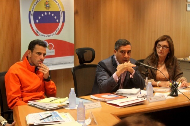 Caracas, 27 de enero de 2014.- Este lunes, se llevó a cabo la segunda reunión del gobernador Henrique Capriles con el ministro de Interior, Justicia y Paz, Miguel Rodríguez Torres y los alcaldes del Área Metropolitana de Caracas, para definir estrategias operativas en torno a la seguridad de los mirandinos y venezolanos. En el encuentro se definió la creación de 158 cuadrantes para la realización de operativos de Patrullaje Inteligente en Caracas, de los cuales 11 fueron asignados bajo la responsabilidad de la policía del estado Miranda.