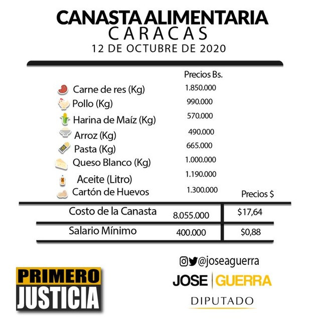 Según Nohelia Gutiérrez, coordinadora de Primero Justicia en el estado Guárico, los venezolanos tendrían que ganar un aproximado de 20,14 sueldos mínimos en Caracas, y un máximo de 21,55 sueldos mínimos en Amazonas, para adquirir tan sólo ocho productos de la canasta alimentaria: carne, pollo, harina de maíz, arroz, pasta, queso blanco, aceite y huevos.