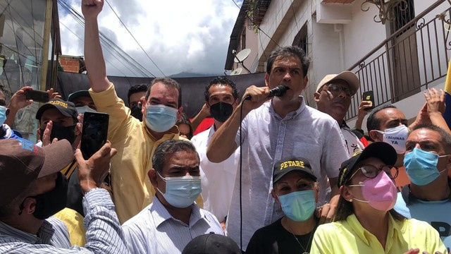 Caracas, 19 de agosto de 2021.- El secretario general nacional de Primero Justicia, Tomás Guanipa, regresó a Venezuela y este jueves acompañó a los dirigentes regionales de la tolda aurinegra, Carlos Ocariz y Andrés Schoetler, durante un acto celebrado en Petare, en el cual estos dos últimos manifestaron su intención de participar en las elecciones regionales de 21 de noviembre, para optar - en caso de que se cumplan las condiciones electorales - a la gobernación de Miranda y la alcaldía de Sucre, respectivamente.